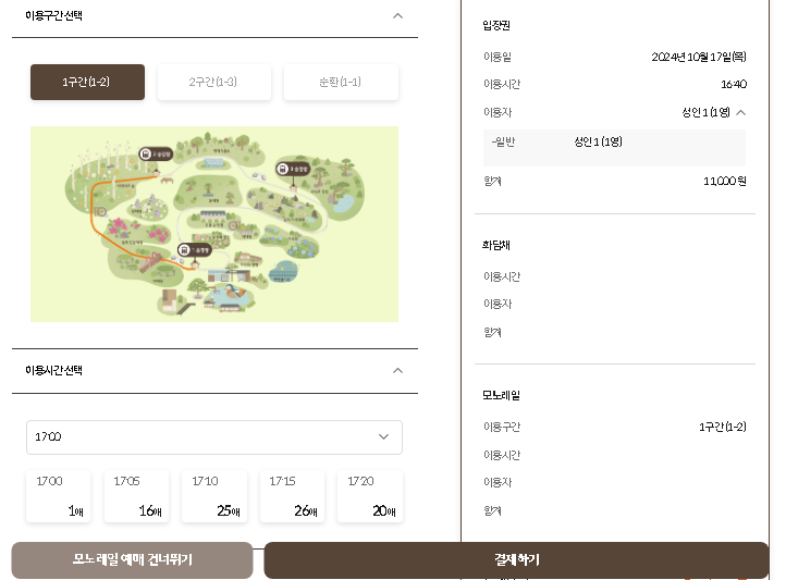 6. 모노레일은 구간 마다 운행을 하는데요 모노레일 구간을 선택한후 결제하기 버튼을 누르시면 결제가 완료가 됩니다,.